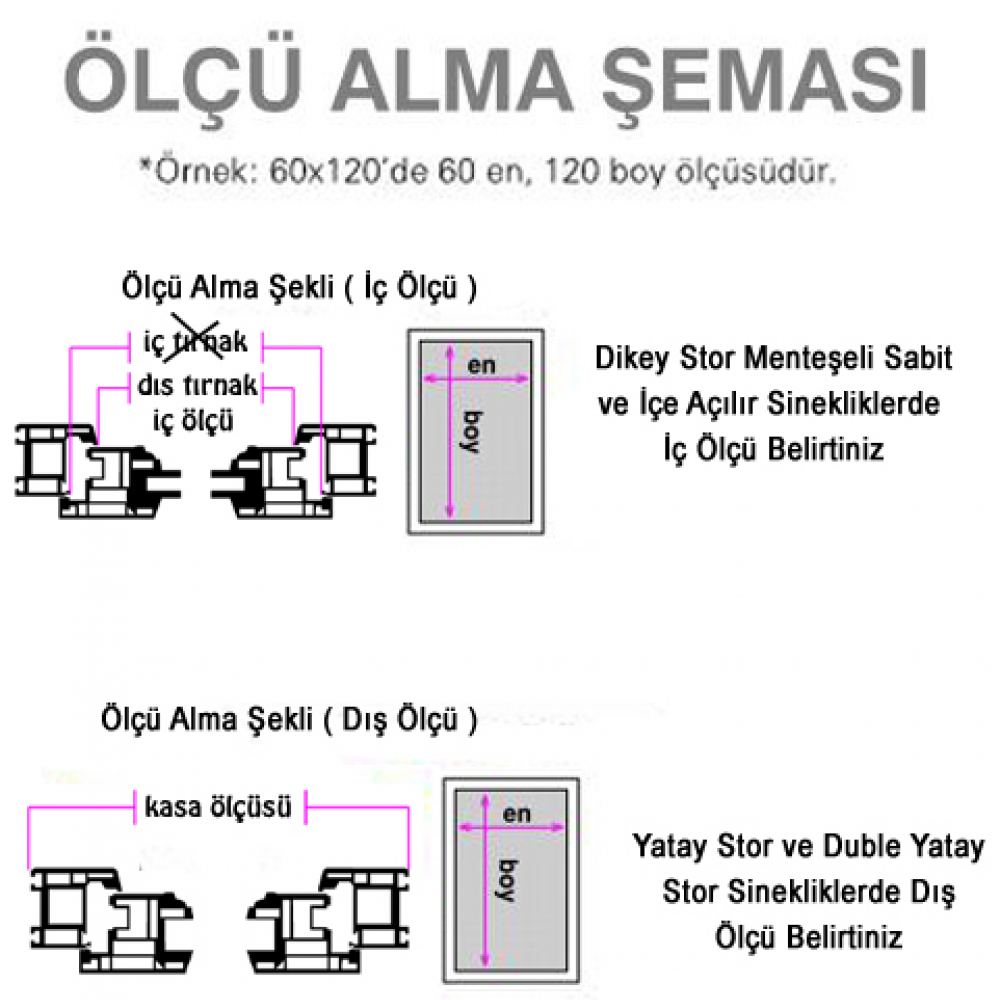 Yapmanız gereken yandaki şemayı takip ederek, ölçmeniz gereken yerler gösterilmiş olup, nasıl ölçü alacağınızı göstermektedir. Metrenizi sineklik yaptırmak istediğiniz pimapen pencerenin, açılan kanadını ilk önce en, sonra boy olarak ölçmektir. Aldığınız ölçülere, yarım cm. (0,5 mm) eklemeyi unutmayın. Almış olduğunuz ölçü sinekliğinizin, bitmiş olacak net ölçüsüdür. Bu ölçülerin üstüne imalat esnasında kesinlikle pay eklenmez.